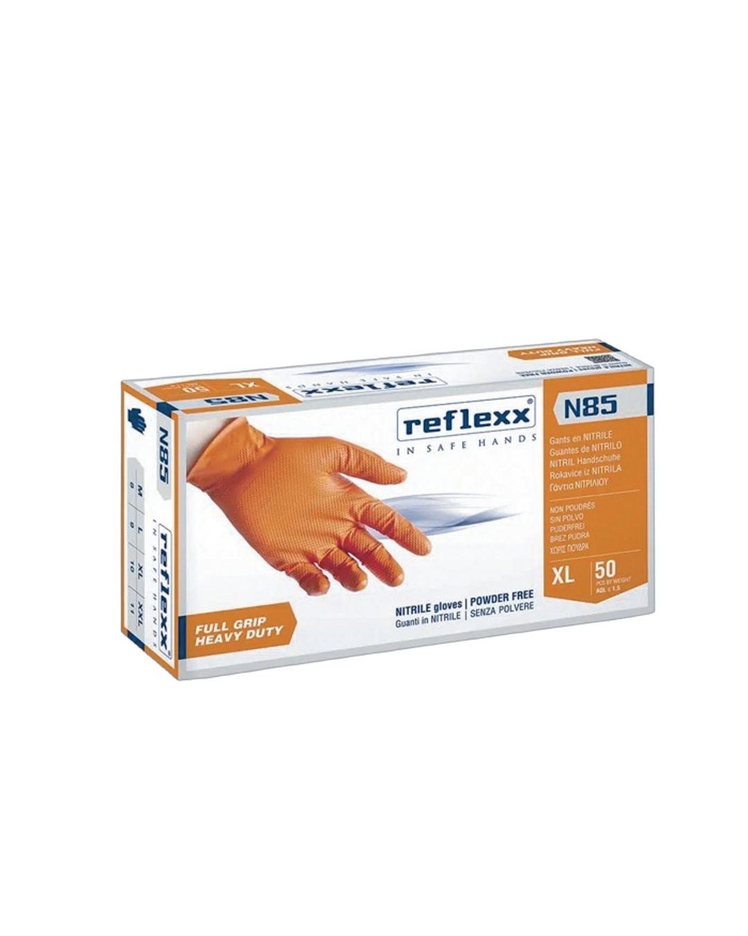 Materiale: nitrile Peso: 8,4gr +/- 0,4 (M); Colore: arancione; Superficie: 3D full grip; Confezione: 50pz
